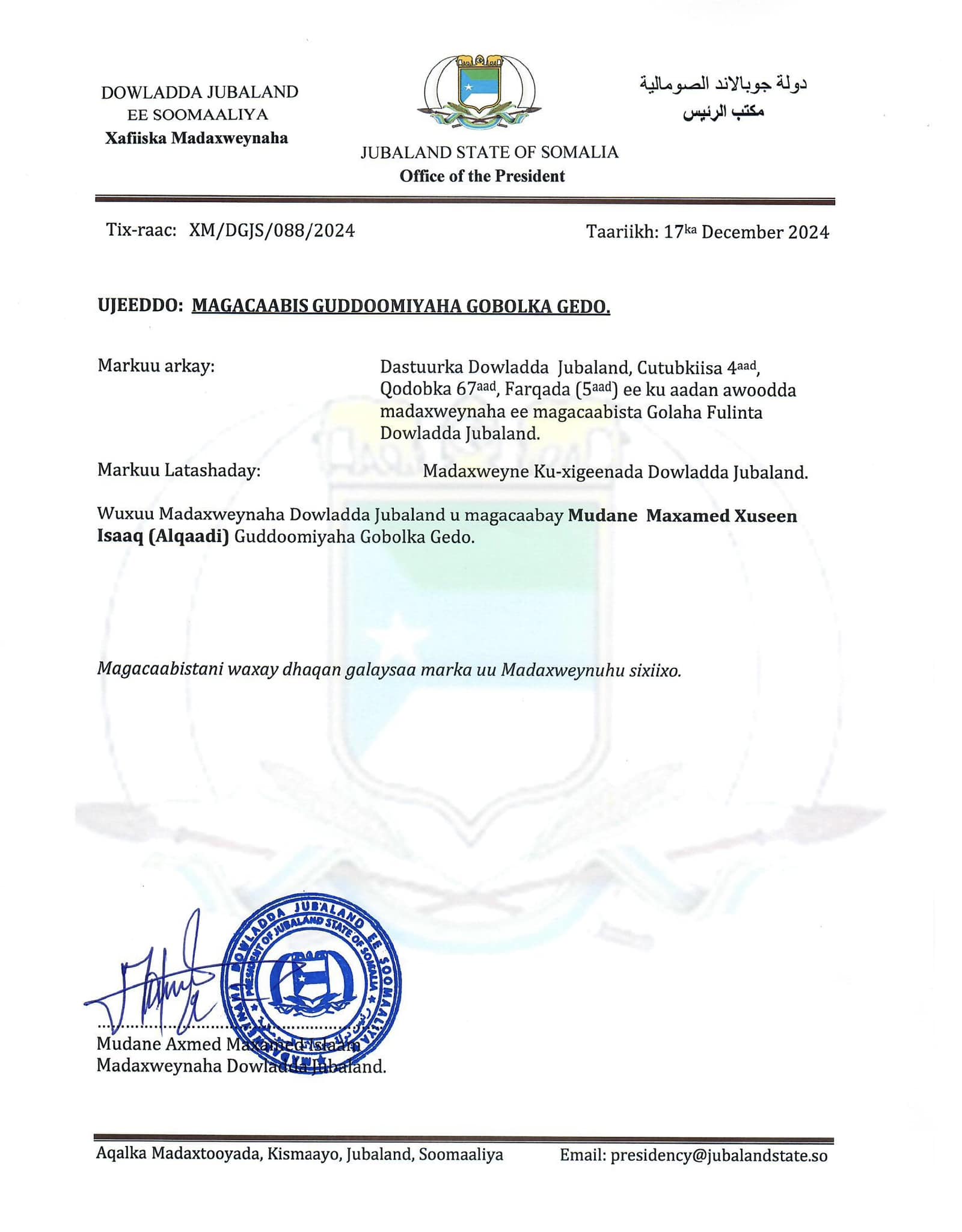 Madaxweynaha ayaa wareegto ka soo baxday xafiiskiisa waxa uu Maxamed Xuseen Isaaq (Al Qaadi) ugu magacaabay in uu noqdo Gudoomiyaha xigga ee Gobolka Gedo.