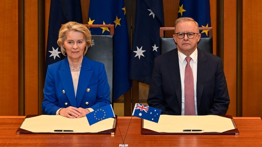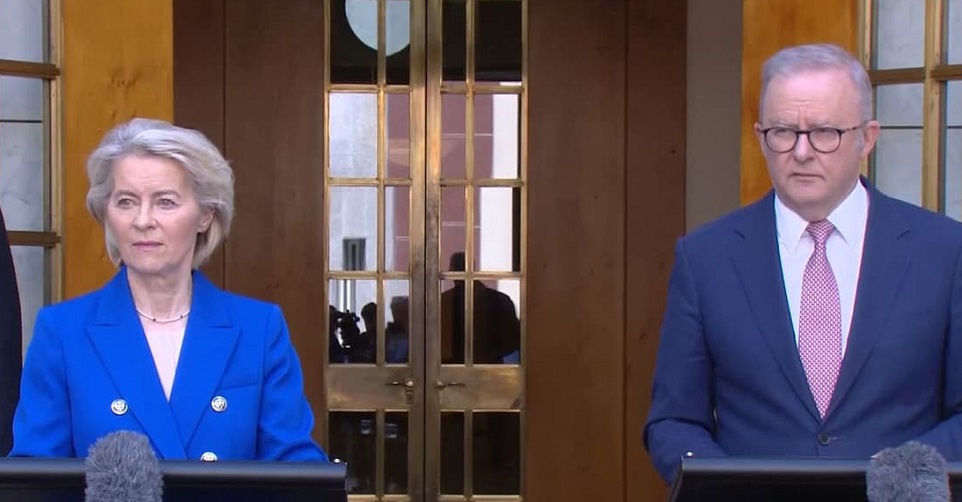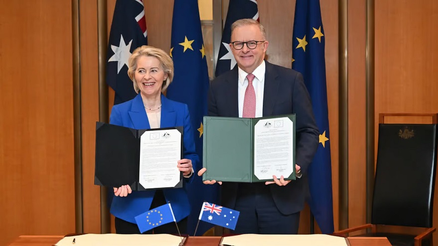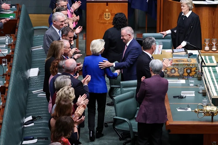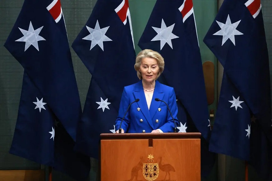 Shirkoodan jaraa'id ayaa geba-gabo ahaa heshiis iskaashi ganacsi oo labada dhinac ay Talaadadan kala saxiixdeen, iyadoona Ursula von der Leyen ay booqatay Xarunta Baarlamaanka Australia ee Canberra, halkaas oo ay kula hadashay Xildhibaanada Baarlamaanka.