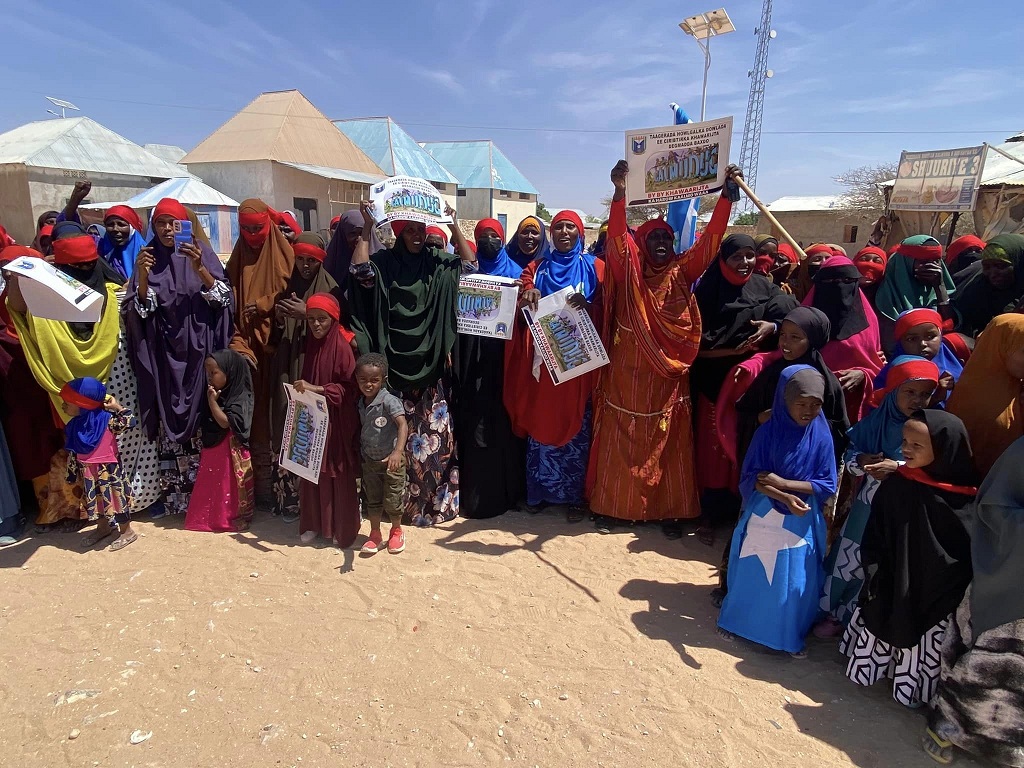 Didbaxayaasha oo ku qaylinayay ereyo lagu taageerayo hawlgalka maleeshiyada Al Shabaab lagaga saarayo deegaanada Galmudug ayaa sidoo kale watay boorar ay ku qoran yihiin hal-ku-dhigyo lagu dhiirigelinayo dagaalka.