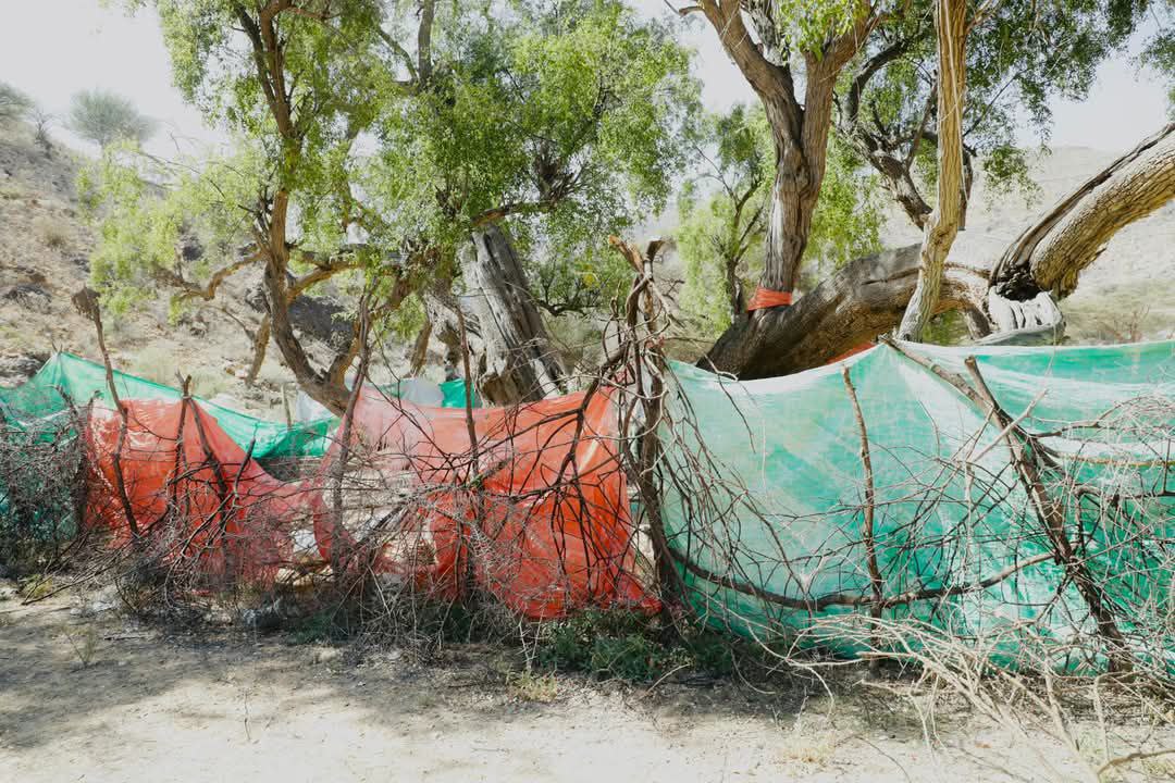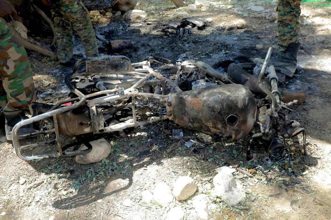 Muuqaalada ayaa laga arki karay gaari iyo mooto la gubay, iyadoo ay maleeshiyadu ku hoos qarisay geed hoostiis, si aanay diyaaraduhu u arag.