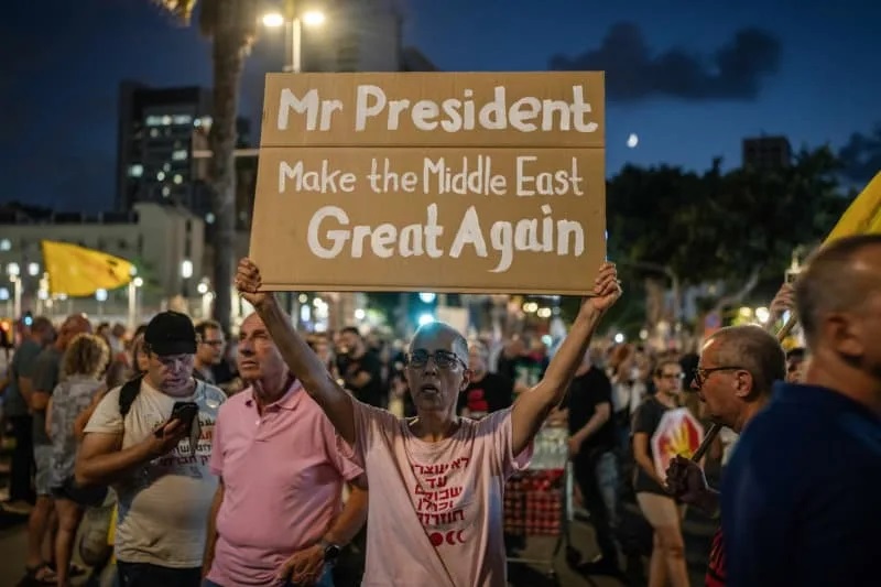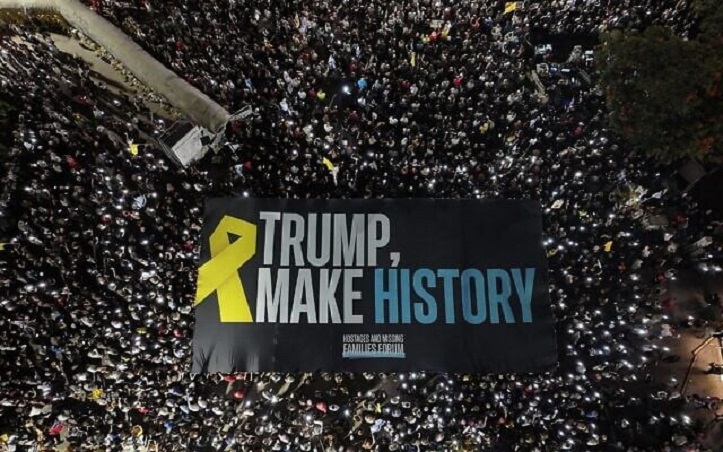 Dibadbaxayaasha Tel Aviv oo kale ayaa watay boor weyn oo uu ku qornaa 'Trump taariikh samee', oo ay uga la jeedaan in uu sameeyo wax kasta oo uu awoodo, si uu uga shaqeeyo heshiiska nabadda ee gobolka.