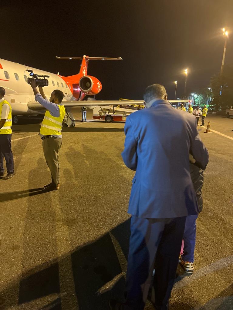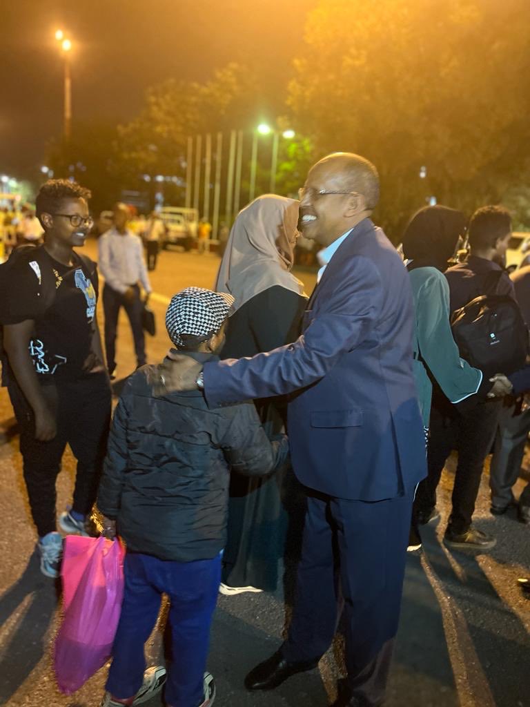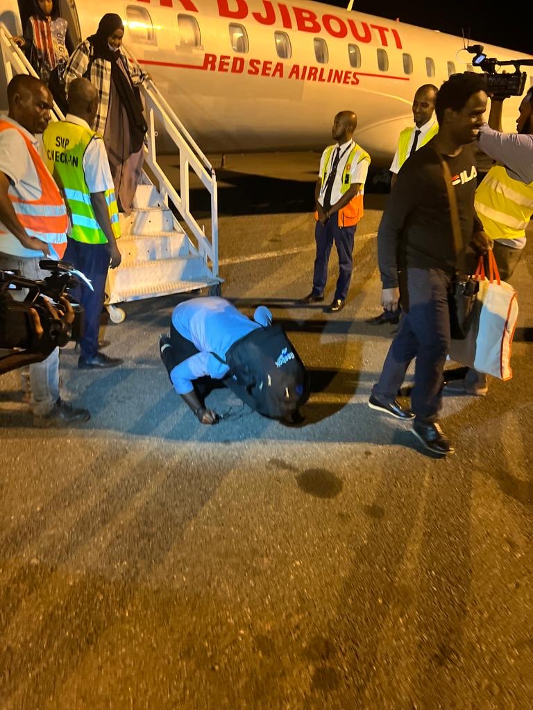 Diyaaradda Air Djibouti ayaa illaa 50 qof oo uu ku jiro Safiirka Jabuuti ee Suudaan, Danjire Ciise Khayre, Shaqaalaha Safaaradda iyo qoysaskooda ka dejisay Garoonka Caasimadda Djibouti, halkaas oo ay ku soo dhaweeyeen Wasiirka Arrimaha Dibadda Jabuuti, Agaasimaha Guud ee Madaxtooyada Jabuuti iyo xubno ka mid ah eheladooda.
