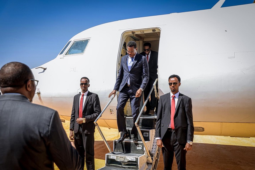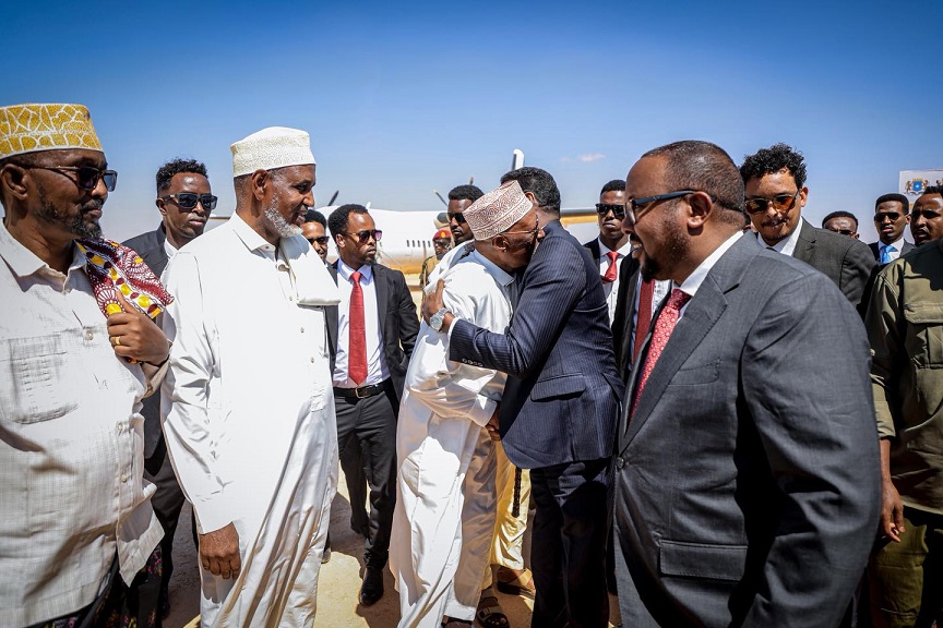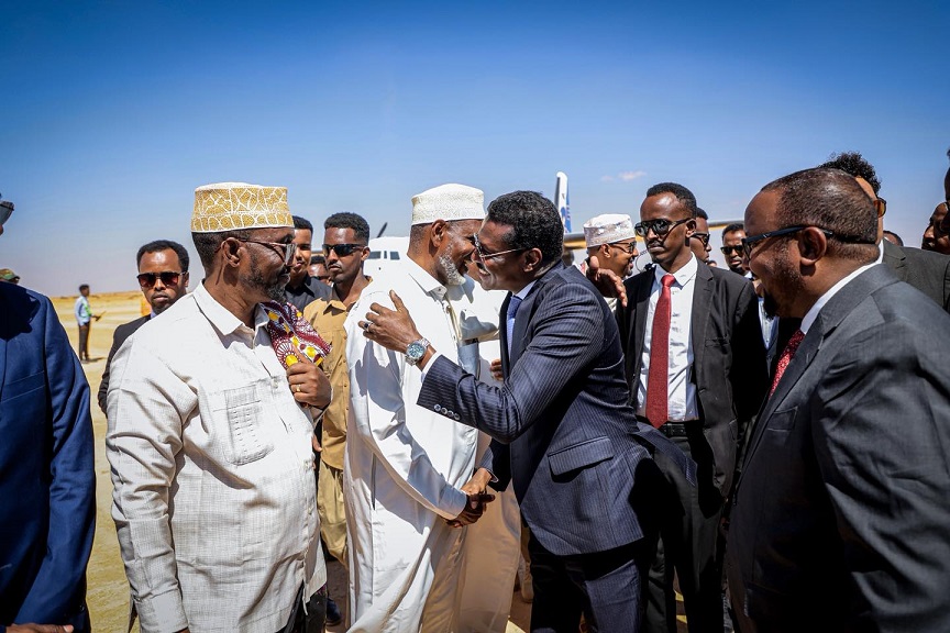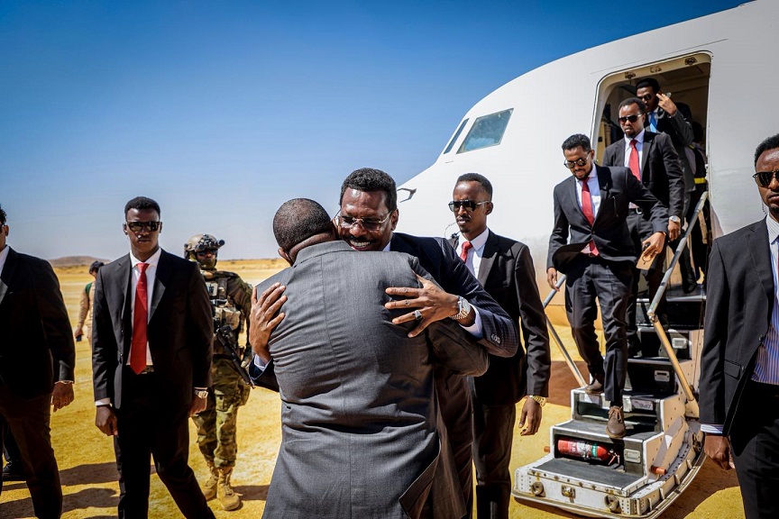 Madaxweynaha Galmudug ayaa waxaa Garoonka Diyaaradaha Laascaanood ku soo dhaweeyay xubno uu ka mid ahaa Madaxweynaha Maamulka Waqooyi Bari, Cabdiqaadir Axmed Aw-Cali (Firdhiye).