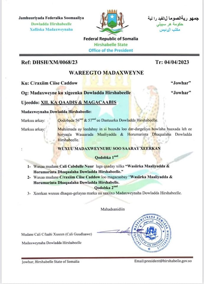 Madaxweynaha Hirshabelle, Cali Cabdullaahi Xuseen (Cali Guudlaawe) ayaa xilka ka qaaday Wasiirkii Wasaaradda Maaliyadda & Horumarinta Dhaqaalaha, Cali Cabdulle Nuur.
