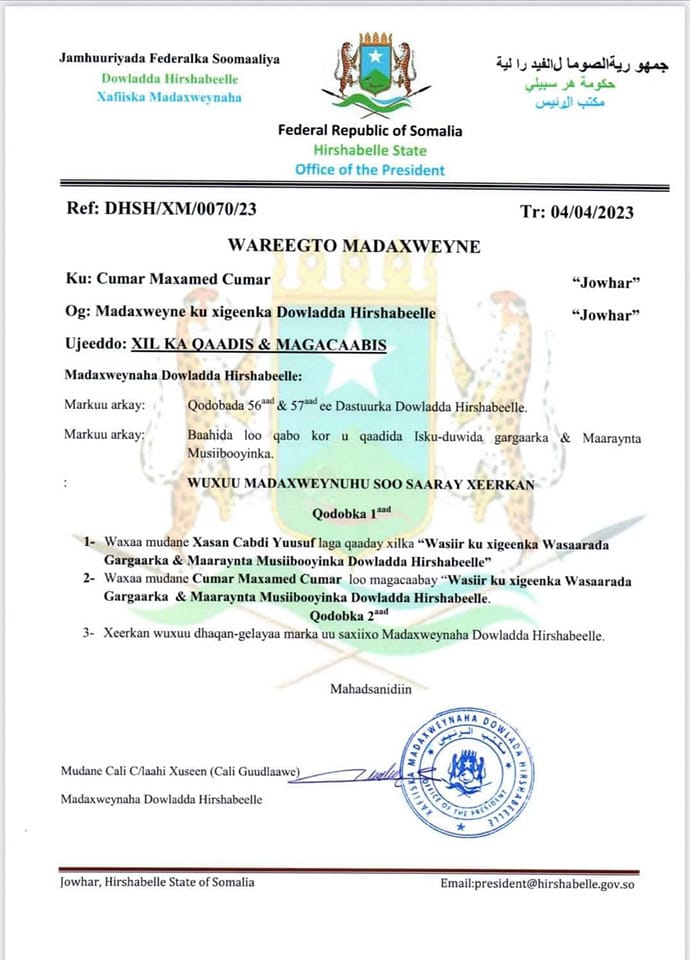 Madaxweynaha Hirshabelle oo xilka ka qaaday Wasiirkii Maaliyadda
