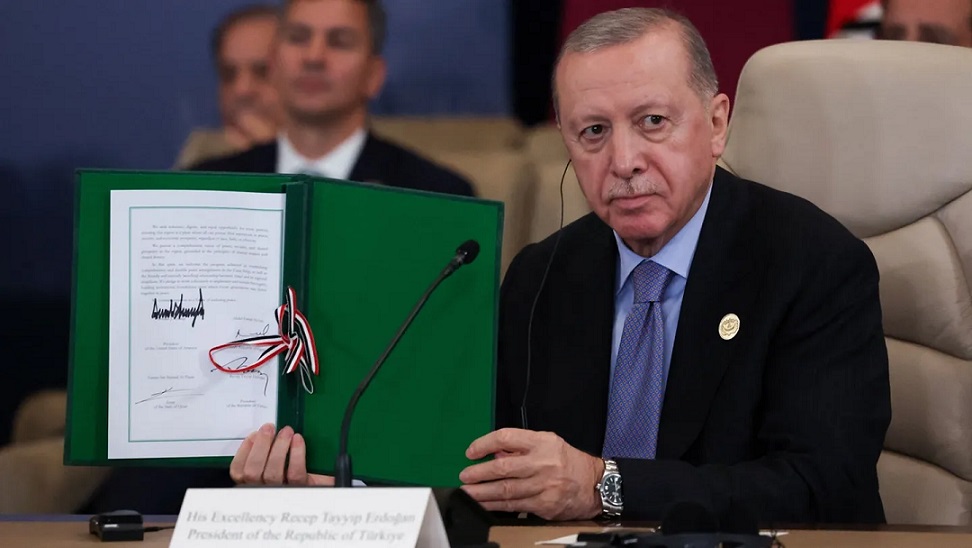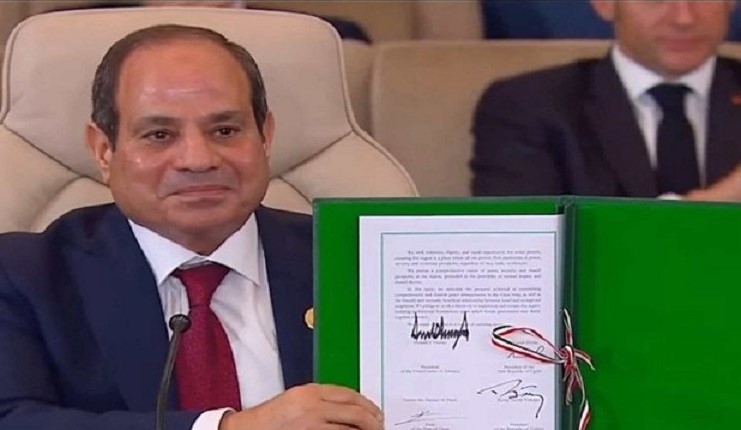Trump, Madaxweynaha Masar, Abdel Fattah El Sisi, Madaxweynaha Turkiga, Recep Tayyip Erdogan iyo Amiirka dalka Qatar, Tamim bin Hamad Al Thani ayaa saxiixay dokumentiga, intii uu socday shirkii caalamiga ahaa ee fiidnimadii caawa ka dhacay Magaalada Sharm El-Sheikh.