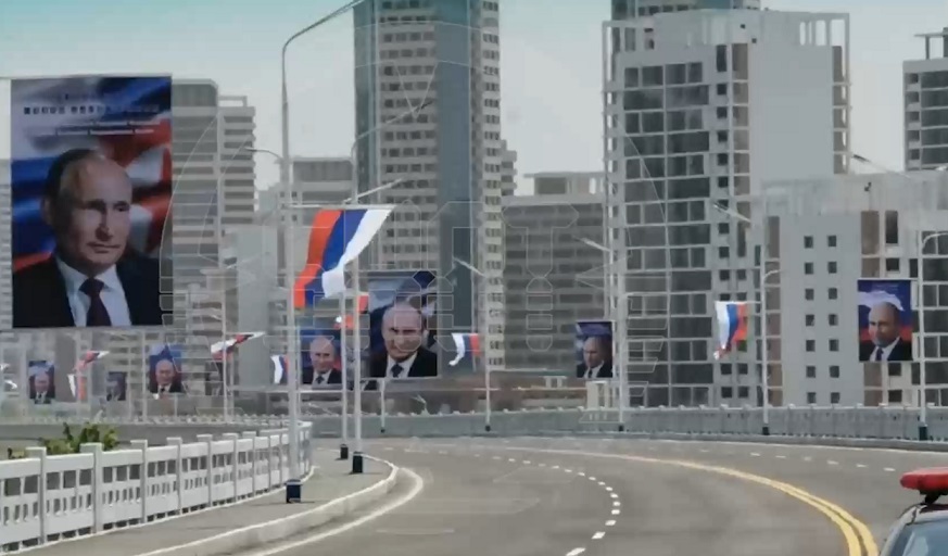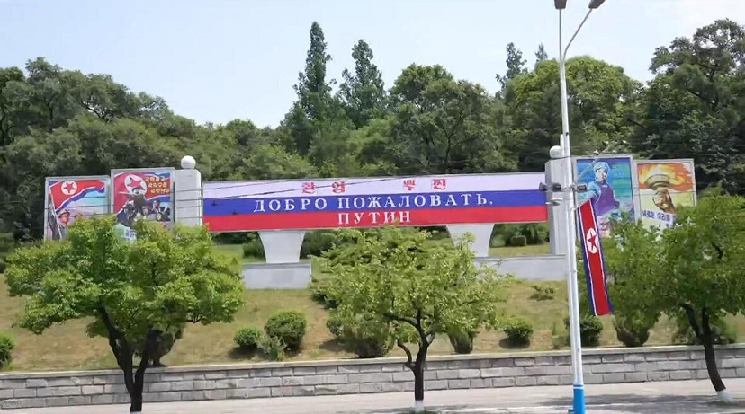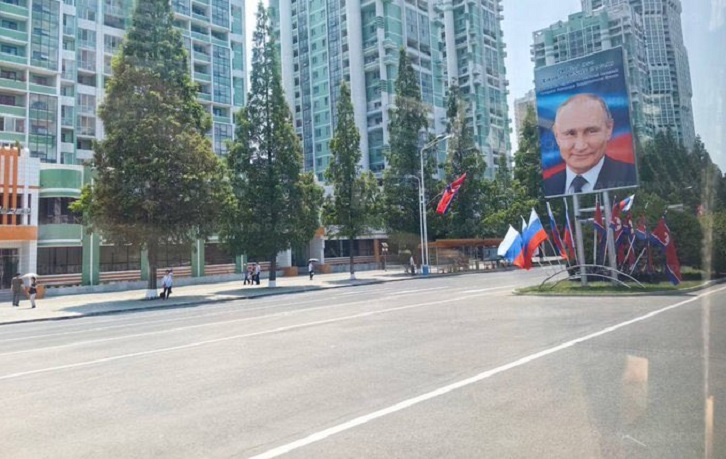 Magaalada Pyongyang ayaa waxaa ka socoto qaban-qaabada soo dhaweynta ee Madaxweynaha Ruushka, iyadoona waddooyinka lagu xardhay Calanka Ruushka iyo sawirrada Putin.