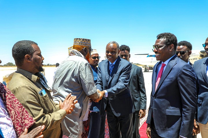 Madaxweynaha iyo wafdigiisa ayaa waxaa Garoonka Diyaaradaha Ugaas Nuur ku soo dhaweeyay masuuliyiin uu ugu sarreyay Madaxweynaha Galmudug, Axmed Cabdi Kaariye (Qoorqoor).