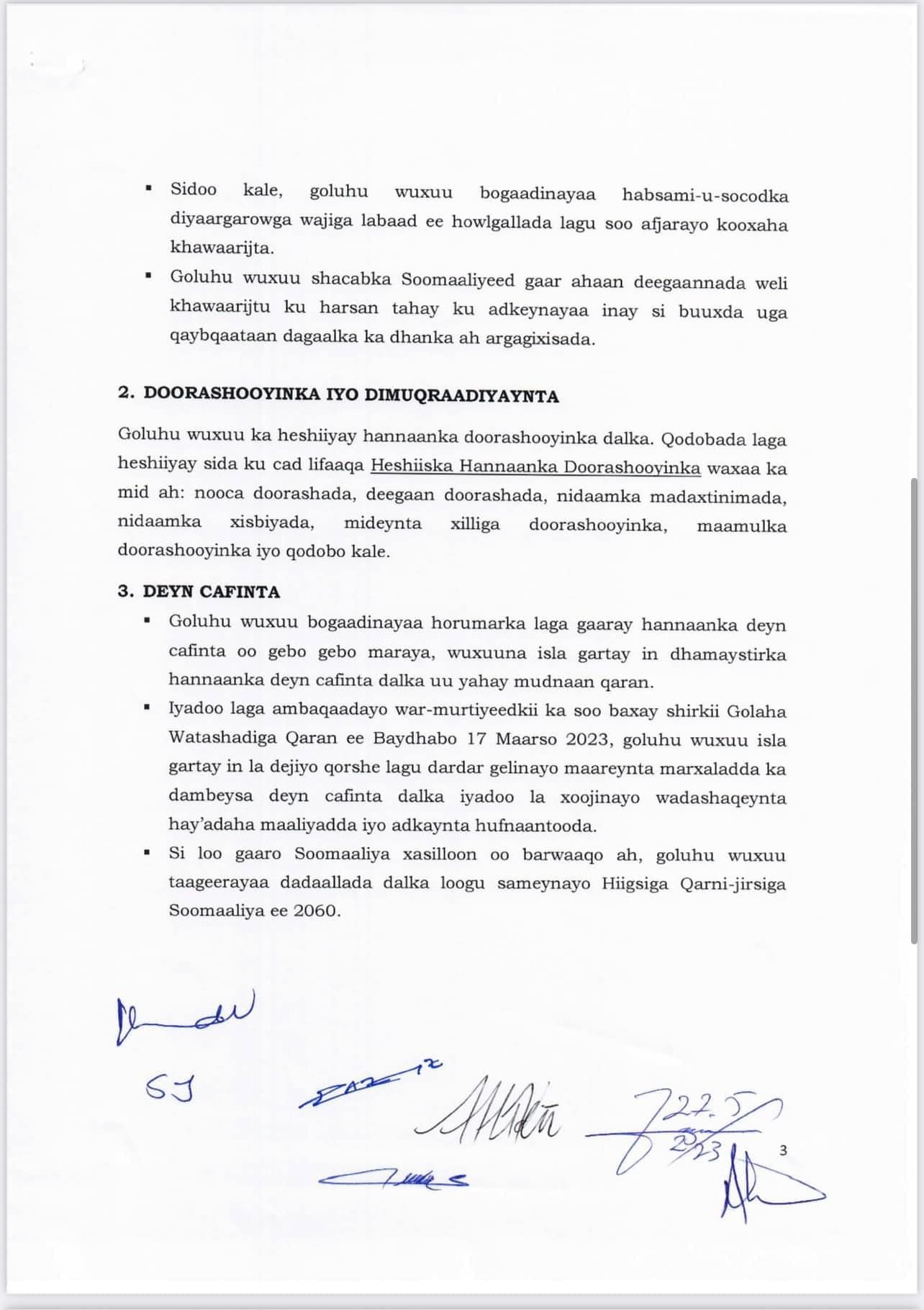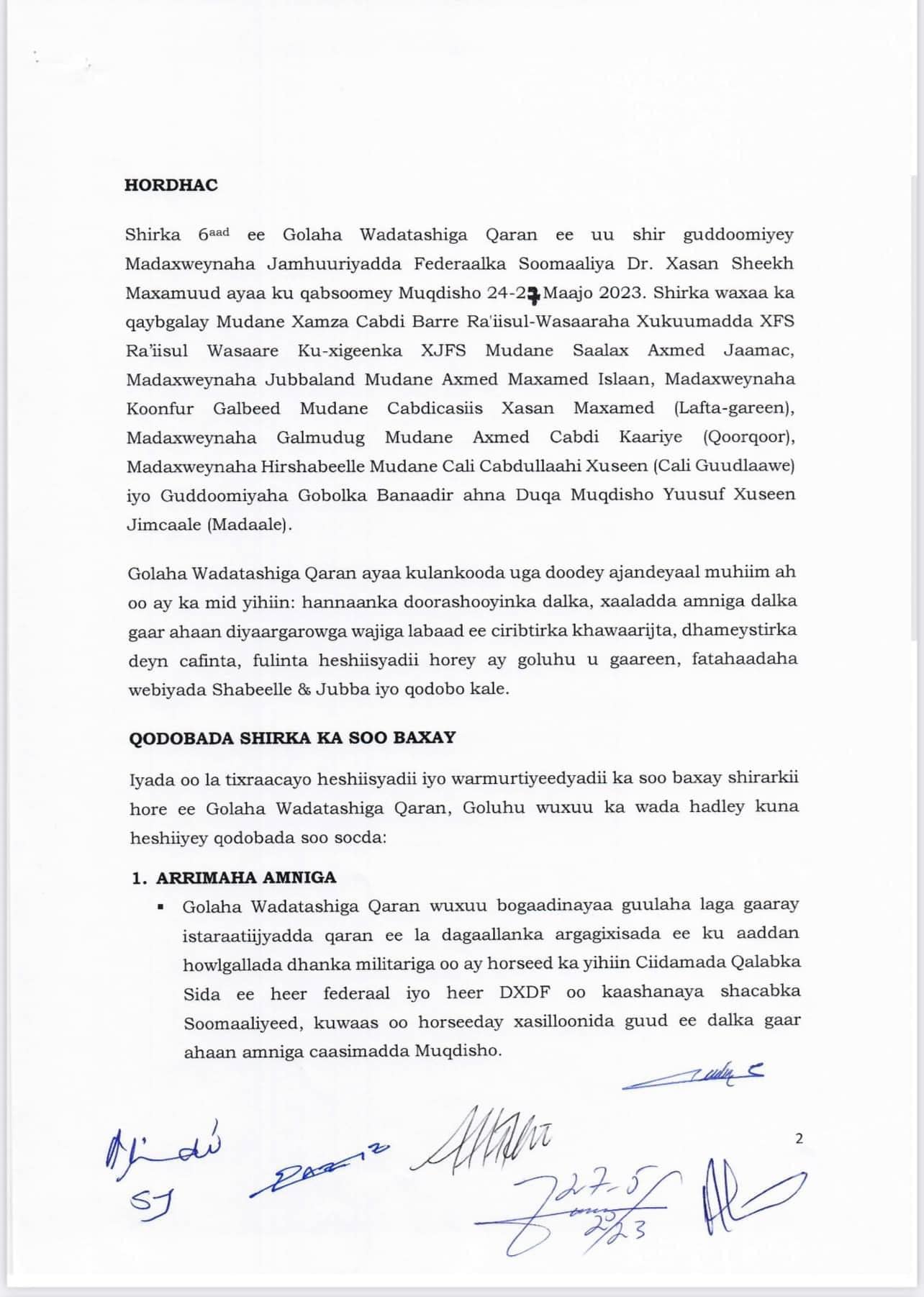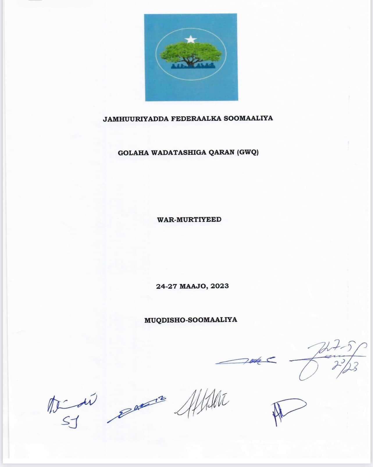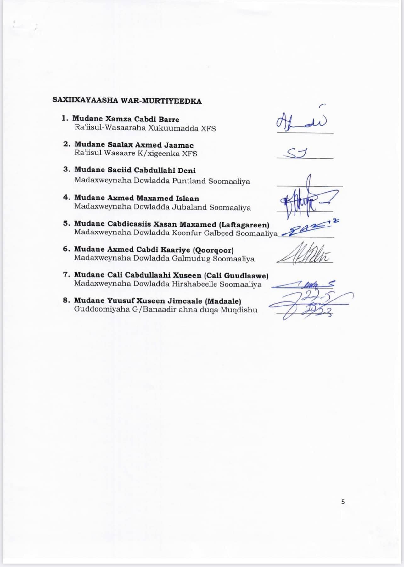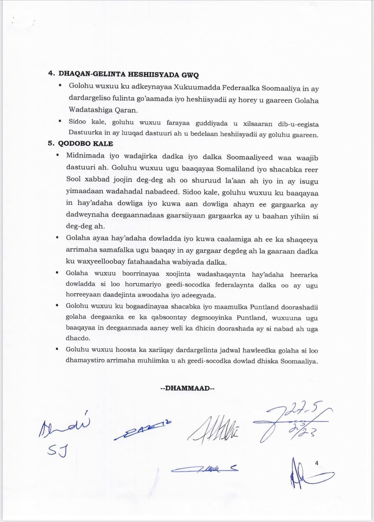 Madaxda Dowladda Federaalka iyo kuwa Dowlad Goboleedyada oo maalmahaanba uu shir uga socday Magaalada Muqdisho ayaa shirkooda ka soo saaray warmurtiyeed ka kooban 5 qodob.