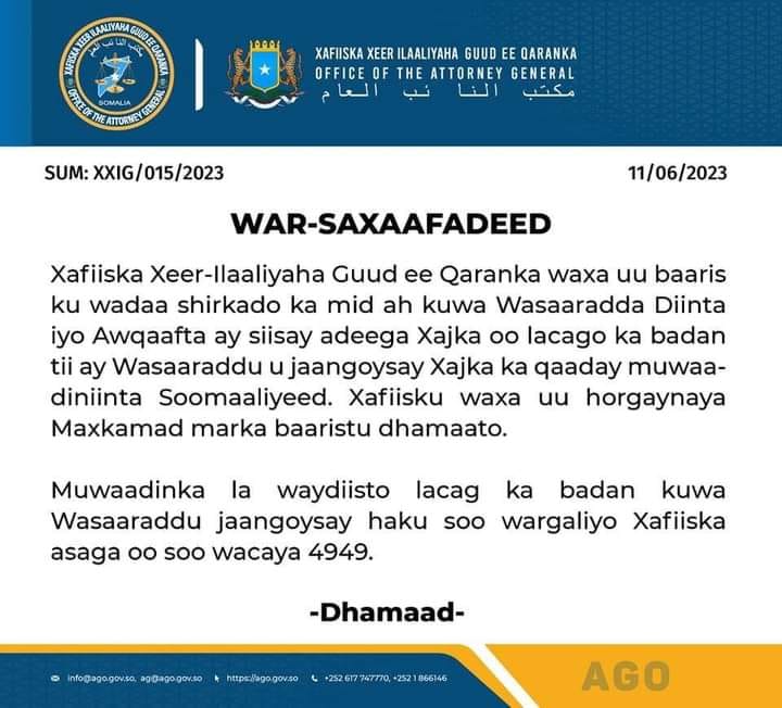 "Xafiiska Xeer Ilaaliyaha Guud ee Qaranka waxa uu baaris ku wadaa shirkado ka mid ah kuwa Wasaaradda Diinta iyo Awqaafta ay sisay Adeegga Xajka oo lacago ka badan tii ay wasaaraddu u jaangoysay Xajka ka qaaday muwaadiniinta Soomaaliyeed. Xafiisku waxa uu horgaynaya maxkamad, marka baaristu dhamaato." Ayaa lagu yiri warqad ka soo baxday Xafiiska Xeer Ilaaliyaha Guud ee Qaranka.